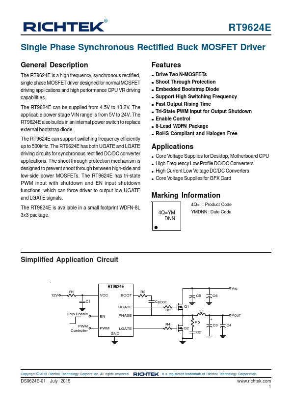 The RT9624E is a high frequency, synchronous rectified, single phase MOSFET driver designed for normal MOSFET driving applications and high performance CPU VR driving capabilities.