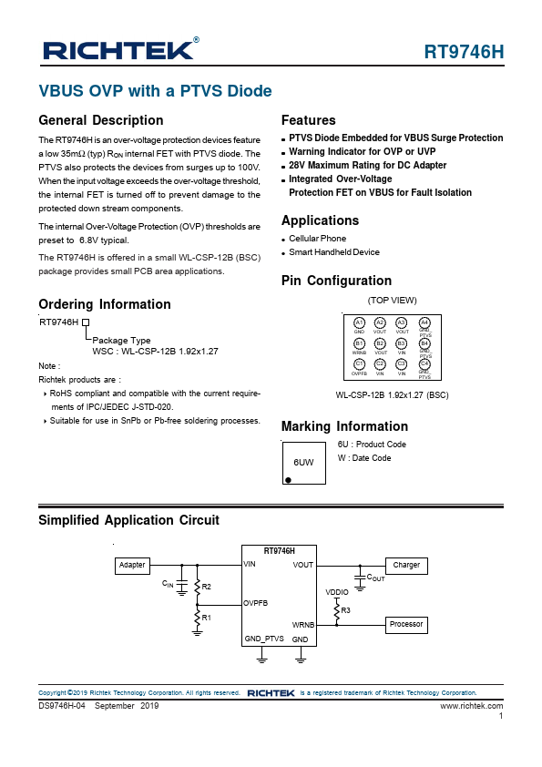 The RT9746H is offered in a small WL-CSP-12B (BSC) package provides small PCB area applications.