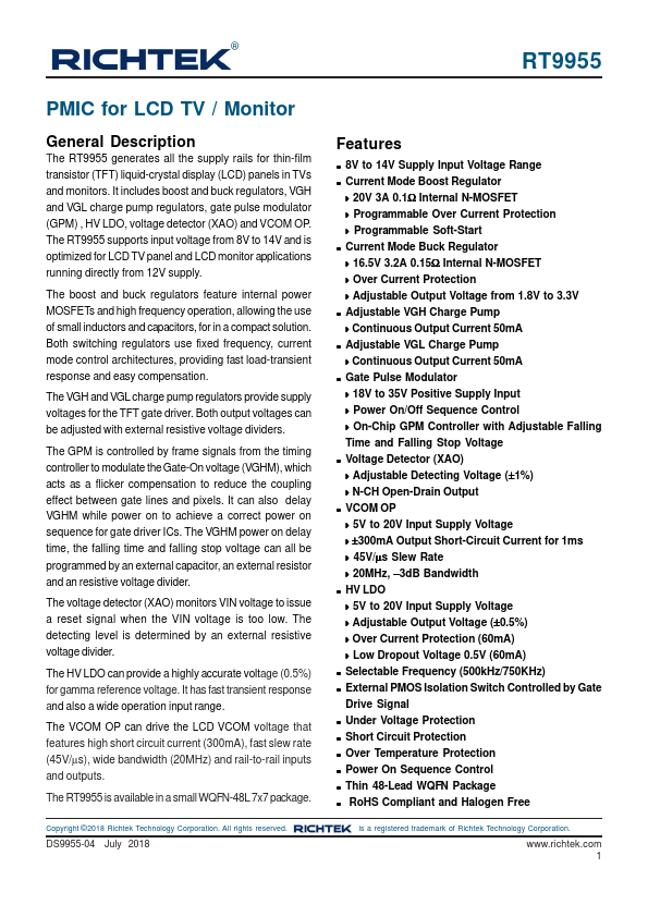 The RT9955 generates all the supply rails for thin-film transistor (TFT) liquid-crystal display (LCD) panels in TVs and monitors. It includes boost and buck regulators, VGH and VGL charge pump regulators, gate pulse modulator (GPM) , HV LDO, voltage detector (XAO) and V OP. The RT9955 supports input voltage from 8V to 14V and is optimized for LCD TV panel and LCD monitor applications running directly from 12V supply.