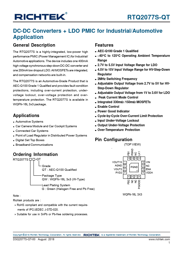 The RTQ2077S is a highly-integrated, low-power high performance PMIC (Power Management IC) for Industrial/ Automotive applications. The device includes one 400mA high voltage synchronous step-down DC-DC converter and one 200mA low dropout LDO. All MOSFETs are integrated, and pensation networks are built-in.