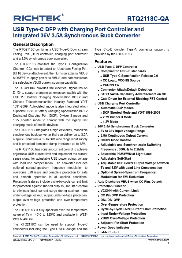 The RTQ2118C combines a USB Type-C Downstream Facing Port (DFP) controller, charging port controller and a 3.5A synchronous buck converter. The RTQ2118C monitors the Type-C Configuration Channel (CC) lines to detect an Upstream Facing Port (UFP) device attach event, then turns on external VBUS MOSFET to apply power to VBUS and communicates the selectable VBUS current sourcing capability.