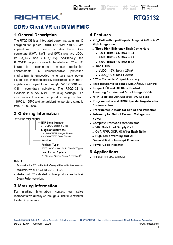 The RTQ5132 is an integrated power management IC designed for general DDR5 SODIMM and UDIMM applications. This device provides three Buck converters (SWA, SWB, and SWC) and two LDOs (VLDO_1.0V and VLDO_1.8V). Additionally, the RTQ5132 supports a selectable interface (I2C or I3C basic) to acmodate various application environments. A prehensive protection mechanism is embedded to ensure safe power distribution, with the capability to record fault events in registers and signal them through PWR_GOOD and GSI_n open-drain indicators. The RTQ5132 is available in a WQFN-28L 3x4 (FC) package. The remended junction temperature range is from
