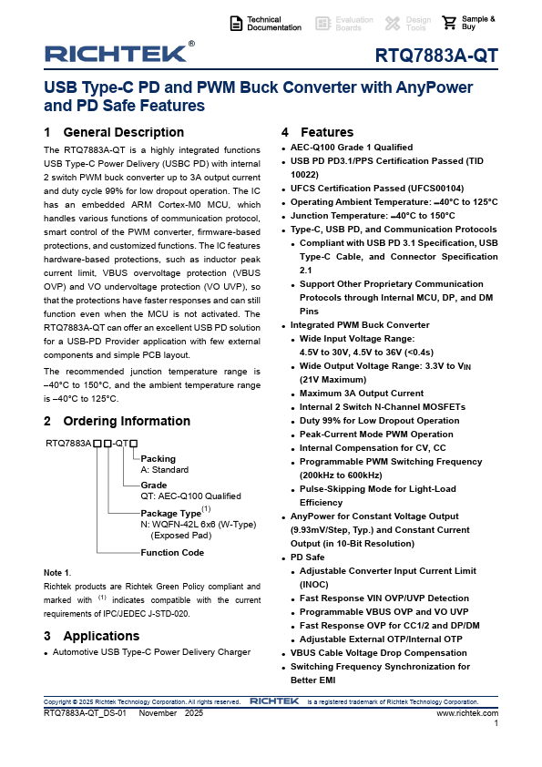 The RTQ7883A-QT is a highly integrated functions USB Type-C Power Delivery (USBC PD) with internal 2 switch PWM buck converter up to 3A output current and duty cycle 99% for low dropout operation. The IC has an embedded ARM Cortex-M0 MCU, which handles various functions of communication protocol, smart control of the PWM converter, firmware-based protections, and customized functions.