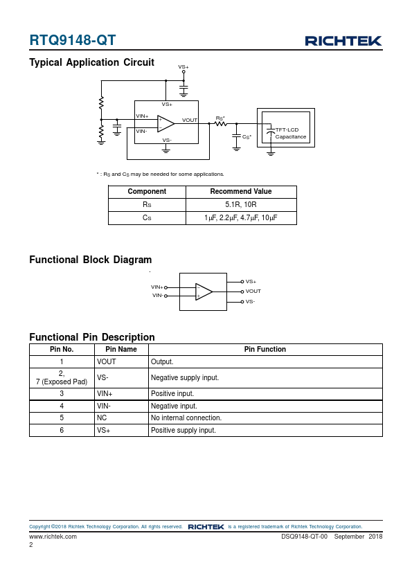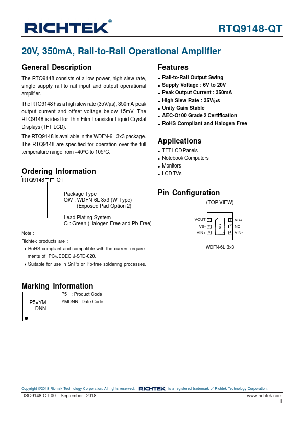 The RTQ9148 consists of a low power, high slew rate, single supply rail-to-rail input and output operational amplifier. The RTQ9148 has a high slew rate (35V/μs), 350mA peak output current and offset voltage below 15mV. The RTQ9148 is ideal for Thin Film Transistor Liquid Crystal Displays (TFT-LCD).