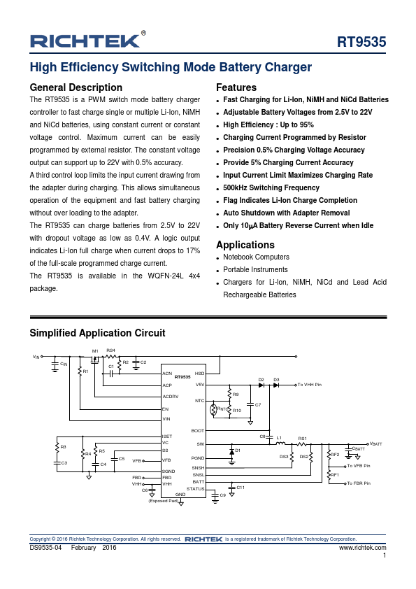 The RT9535 is a PWM switch mode battery charger controller to fast charge single or multiple Li-Ion, NiMH and NiCd batteries, using constant current or constant voltage control. Maximum current can be easily programmed by external resistor. The constant voltage output can support up to 22V with 0.5% accuracy.