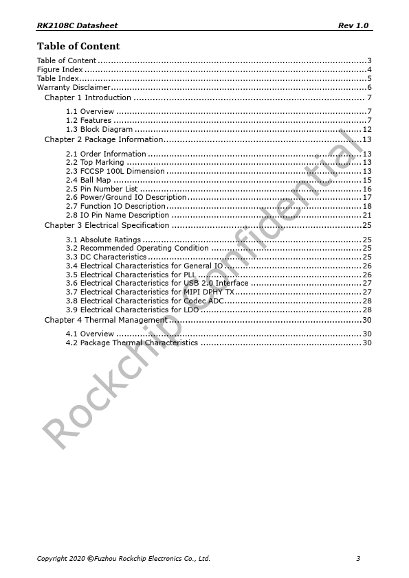 2 RK2108C Datasheet Rev 1.0 Table of Content Table of Content ......................................................................................................3 Figure Index ...........................................................................................................4 Table Index.............................................................................................................5 Warranty Disclaimer.................................................................................................6 Chapter 1 Introduction .....................................................................................