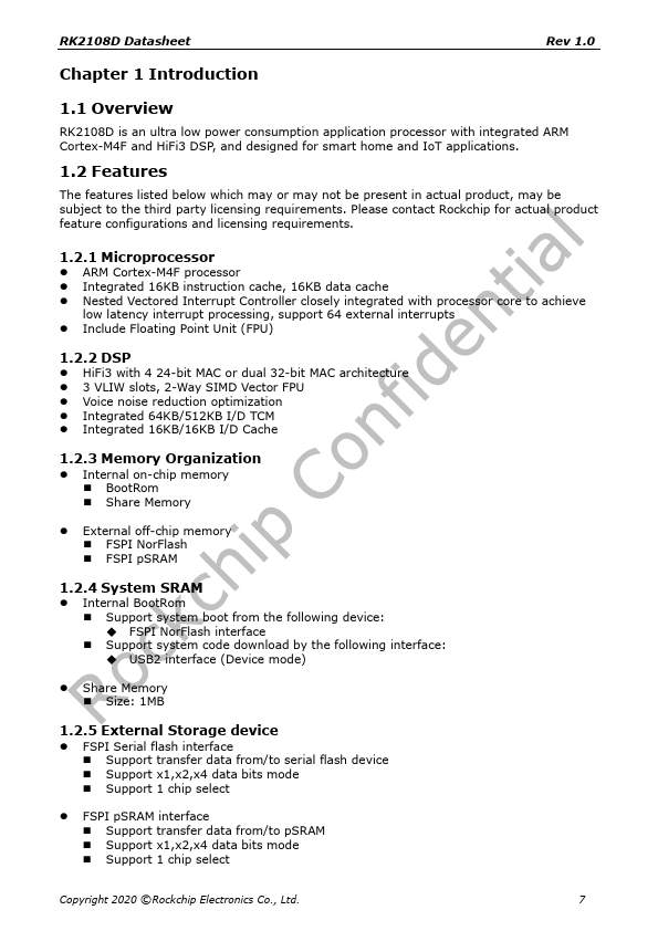 RK2108D Datasheet Rev 1.0 Rockchip RK2108D Datasheet Revision 1.0 June. 2020 Copyright 2020 ©Rockchip Electronics Co., Ltd. 1 RK2108D Datasheet Rev 1.0 Chapter 1 Introduction 1.1 Overview RK2108D is an ultra low power consumption application processor with integrated ARM Cortex-M4F and HiFi3 DSP, and designed for smart home and IoT applications.