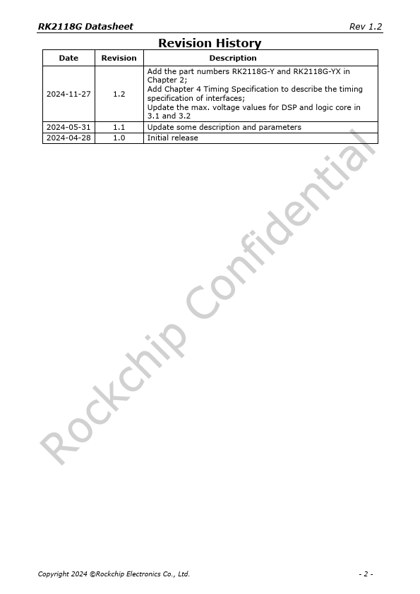 Overview: RK2118G Datasheet Rev 1.2 Rockchip RK2118G Datasheet Revision 1.2 Nov. 2024 Copyright 2024 ©Rockchip Electronics Co., Ltd. -1- RK2118G Datasheet Date Revision 2024-11-27 1.2 2024-05-31 1.1 2024-04-28 1.0 Rev 1.