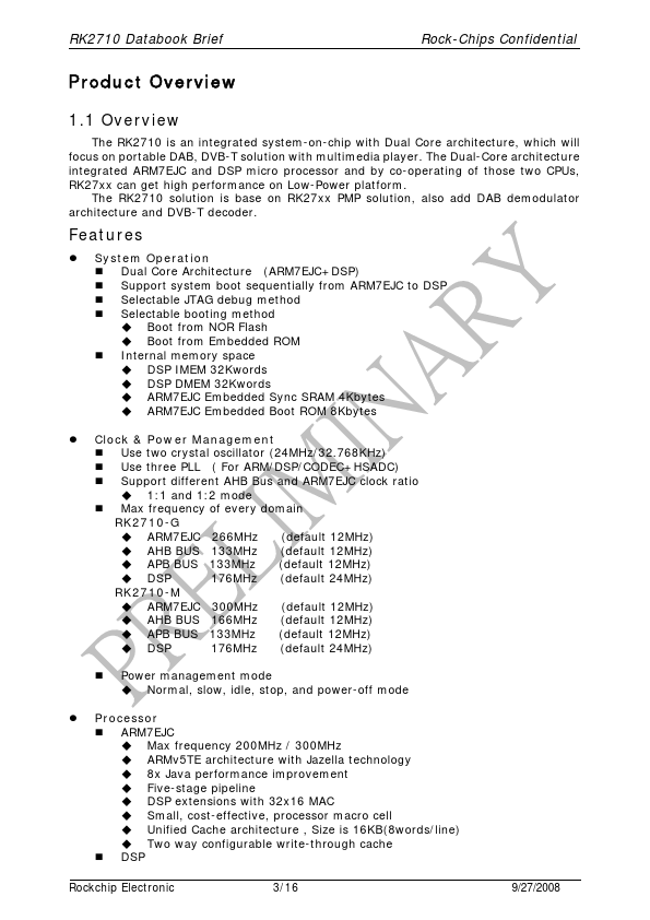The Dual-Core architecture integrated ARM7EJC and DSP micro processor and by co-operating of those two CPUs, RK27xx can get high performance on Low-Power platform. The RK2710 solution is base on RK27xx PMP solution, also add DAB demodulator architecture and DVB-T decoder.