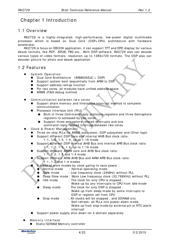 RK2729 is focus on EBOOK application, it can support TFT and EPD display for various ebook formats, like PDF,EPUB, FB2,etc.. With DSP software, RK2729 also can decode various types of video formats, resolution up to 1280x720 formats. The DSP also can decoder picture for photo and ebook application.