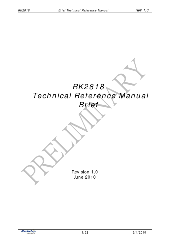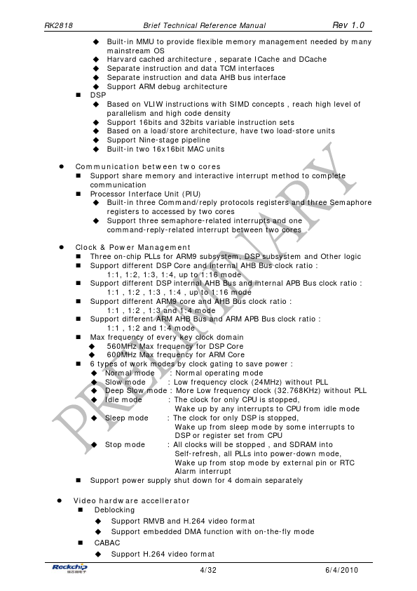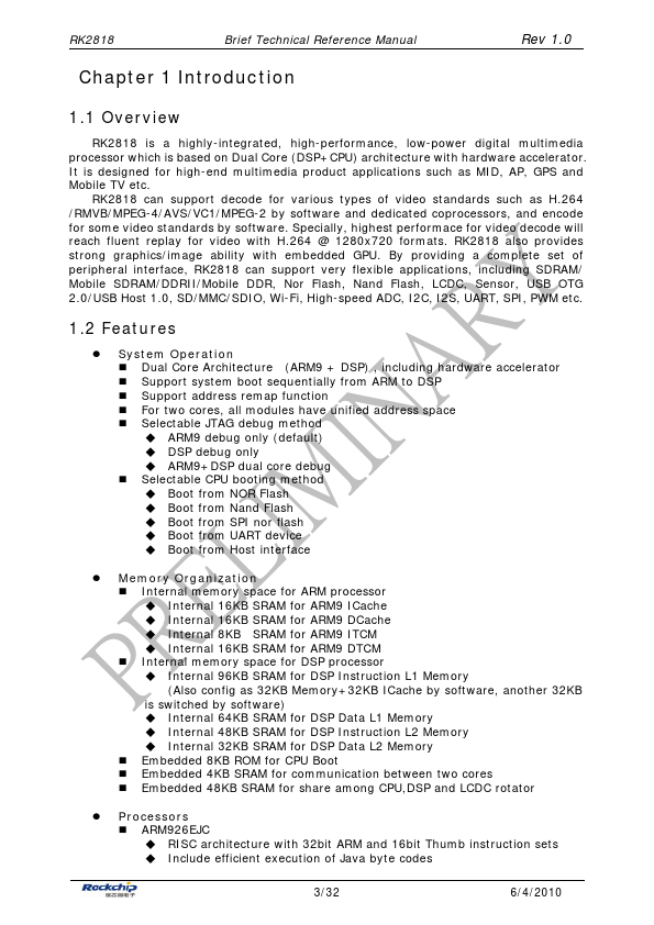 It is designed for high-end multimedia product applications such as MID, AP, GPS and Mobile TV etc. RK2818 can support decode for various types of video standards such as H.264 /RMVB/MPEG-4/AVS/VC1/MPEG-2 by software and dedicated coprocessors, and encode for some video standards by software. Specially, highest performace for video decode will reach fluent replay for video with H.264 @ 1280x720 formats.