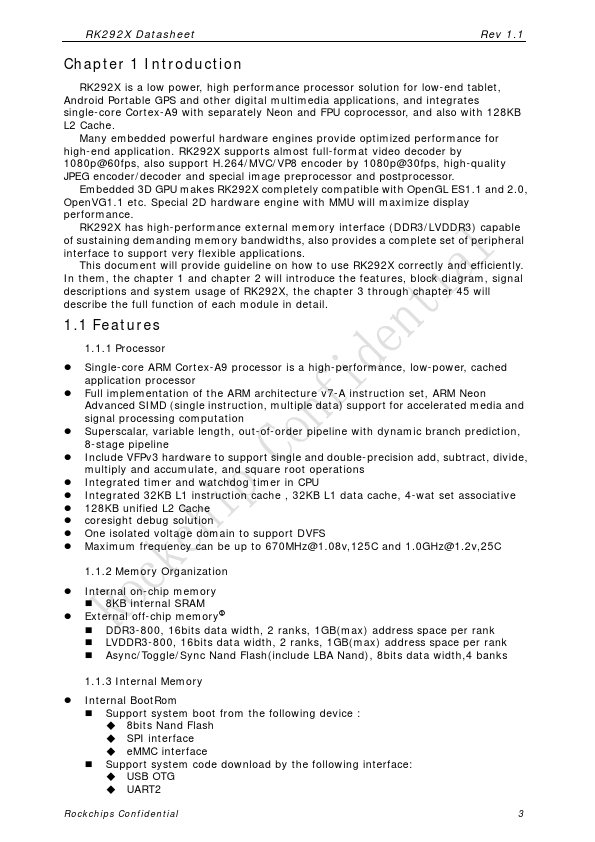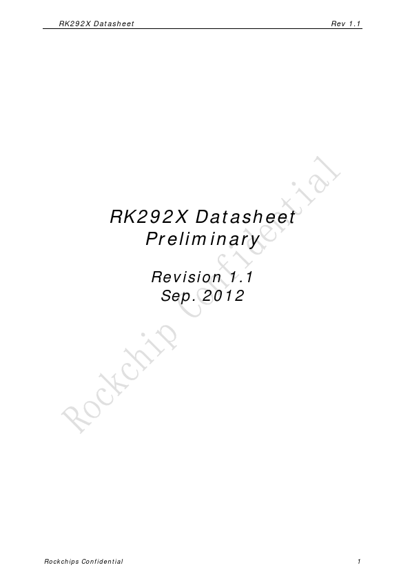RK292X Datasheet Rev 1.1 RK292X Datasheet Preliminary Revision 1.1 Sep. 2012 Rockchips Confidential 1 RK292X Datasheet Rev 1.1 Chapter 1 Introduction RK292X is a low power, high performance processor solution for low-end tablet, Android Portable GPS and other digital multimedia applications, and integrates single-core Cortex-A9 with separately Neon and FPU coprocessor, and also with 128KB L2 Cache. Many embedded...