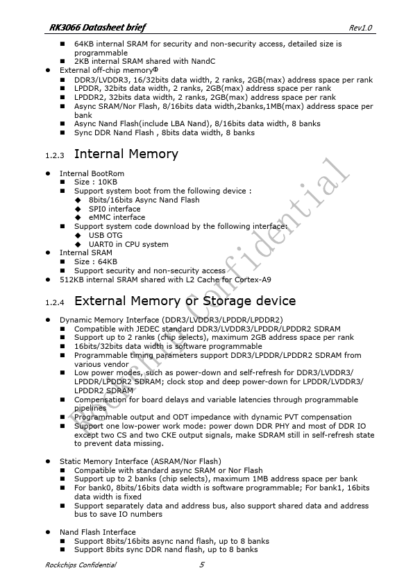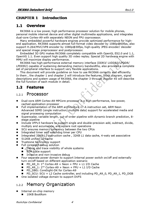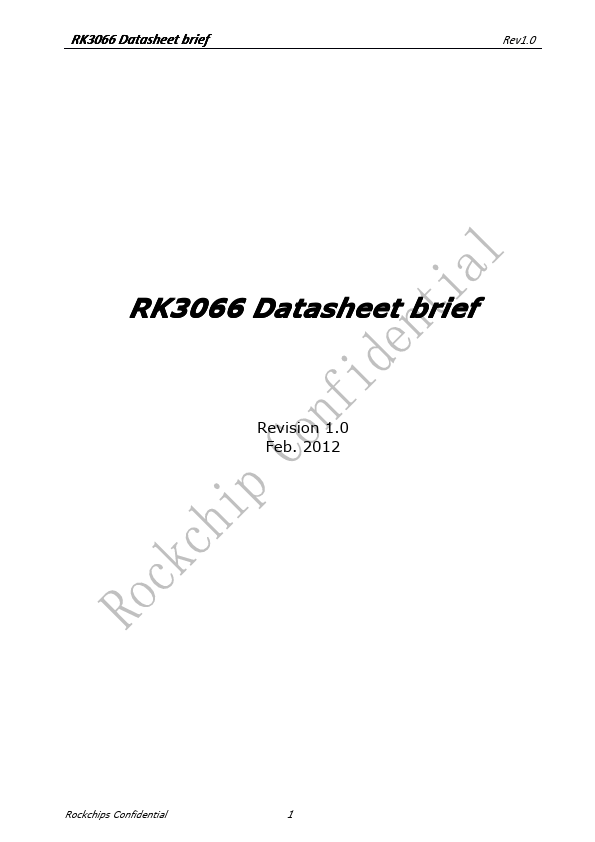 RK3066 Datasheet brief Rev1.0 RK3066 Datasheet brief Revision 1.0 Feb. 2012 Rockchips Confidential 1 RK3066 Datasheet brief Rev1.0 CHAPTER 1 Introduction 1.1 Overview RK3066 is a low power, high performance processor solution for mobile phones, personal mobile internet device and other digital multimedia applications, and integrates dual-core Cortex-A9 with separately NEON and FPU coprocessor. Many embedded powerful...