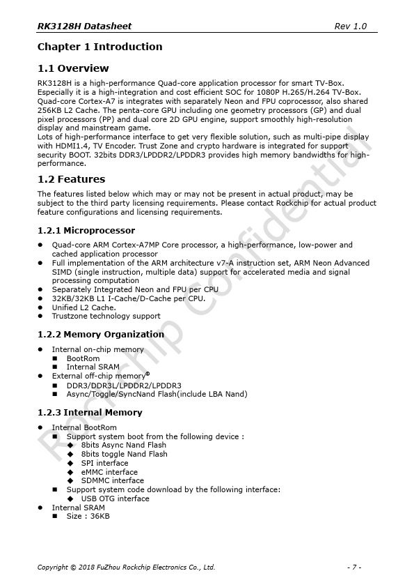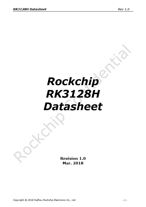 RK3128H Datasheet Rev 1.0 Rockchip RK3128H Datasheet Revision 1.0 Mar. 2018 Copyright © 2018 FuZhou Rockchip Electronics Co., Ltd. -1- RK3128H Datasheet Rev 1.0 Chapter 1 Introduction 1.1 Overview RK3128H is a high-performance Quad-core application processor for smart TV-Box.