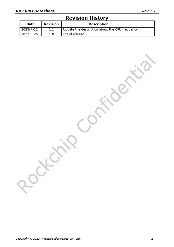 Update the description about the CPU frequency Initial release Rev 1.1 Copyright © 2023, Rockchip Electronics Co., Ltd.