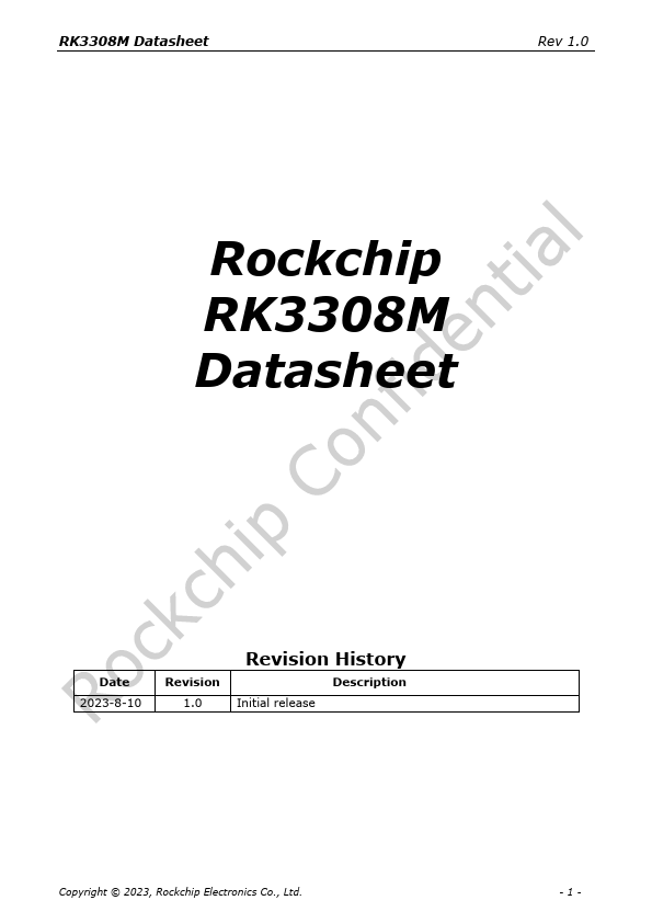 Initial release Copyright © 2023, Rockchip Electronics Co., Ltd. -1- RK3308M Datasheet Rev 1.0 Chapter 1 Introduction 1.1 Overview RK3308M is a high-performance Quad-core application processor designed for intelligent voice interaction, audio input/output processing, and other digital multimedia applications. Embedded rich audio interfaces, such as I2S, PCM, TDM, PDM, SPDIF, HDMI ARC and so on, can meet different...