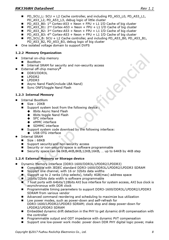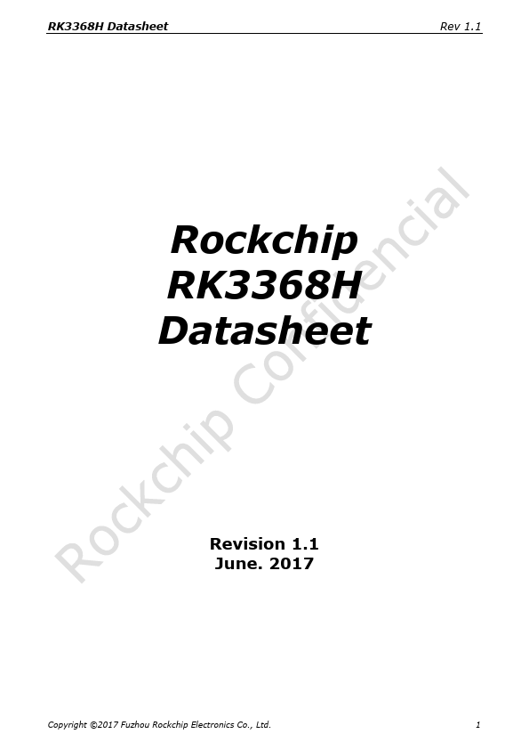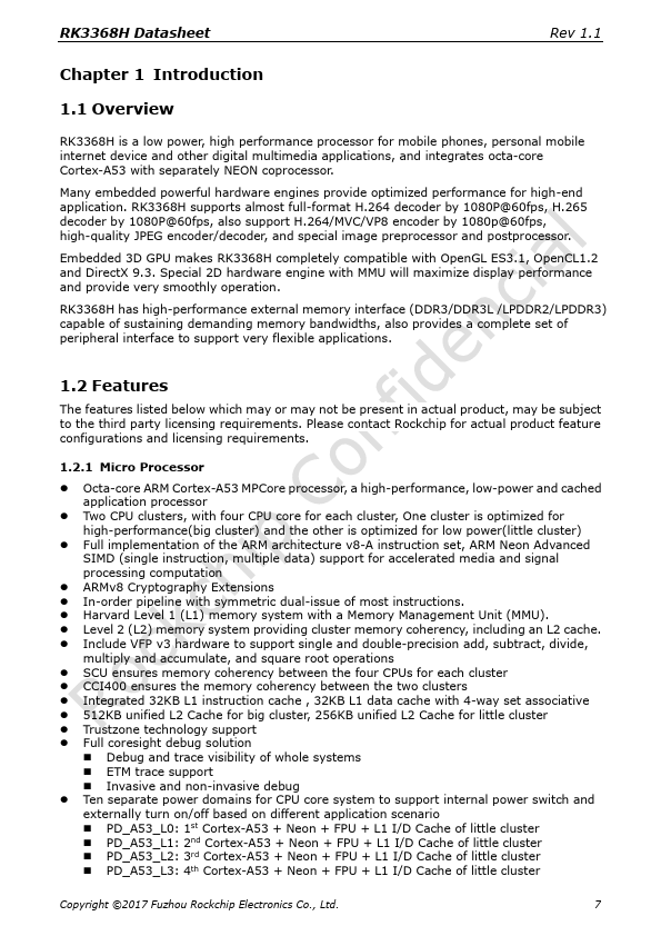 RK3368H Datasheet Rev 1.1 Rockchip RK3368H Datasheet Revision 1.1 June. 2017 Copyright ©2017 Fuzhou Rockchip Electronics Co., Ltd. 1 RK3368H Datasheet Rev 1.1 Chapter 1 Introduction 1.1 Overview RK3368H is a low power, high performance processor for mobile phones, personal mobile internet device and other digital multimedia applications, and integrates octa-core Cortex-A53 with separately NEON coprocessor.