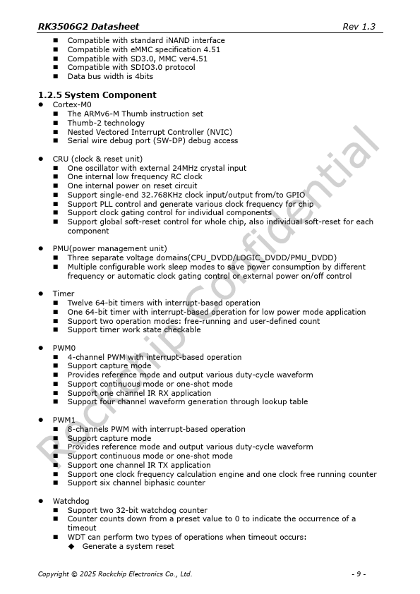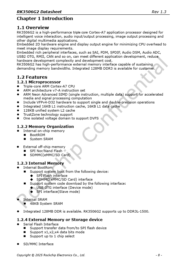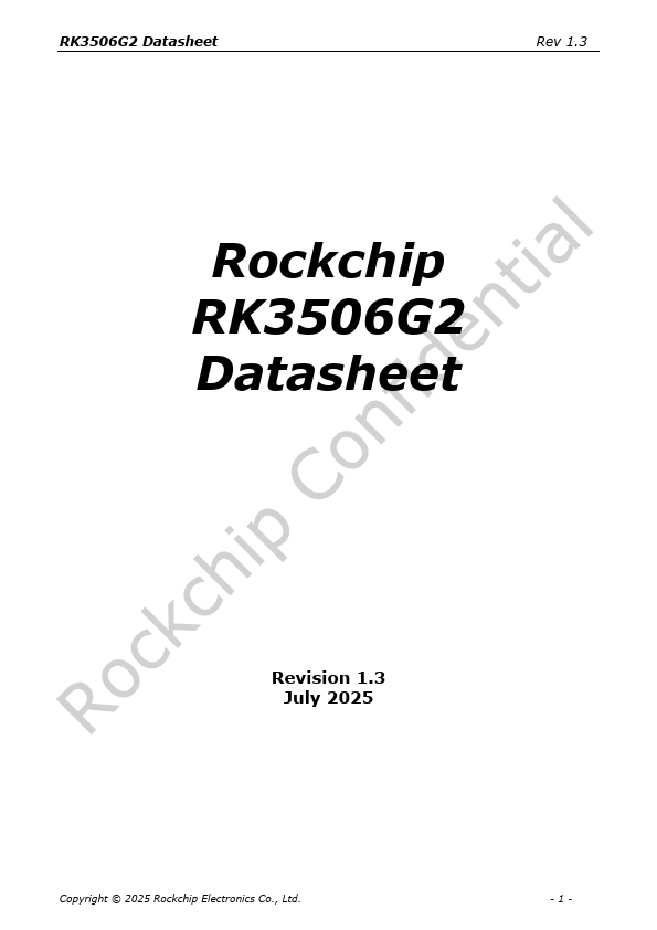 RK3506G2 Datasheet Rev 1.3 Rockchip RK3506G2 Datasheet Revision 1.3 July 2025 Copyright © 2025 Rockchip Electronics Co., Ltd. -1- RK3506G2 Datasheet Chapter 1 Introduction Rev 1.3 1.1 Overview RK3506G2 is a high-performance triple core Cortex-A7 application processor designed for intelligent voice interaction, audio input/output processing, image output processing and other digital multimedia applications. Embedded...