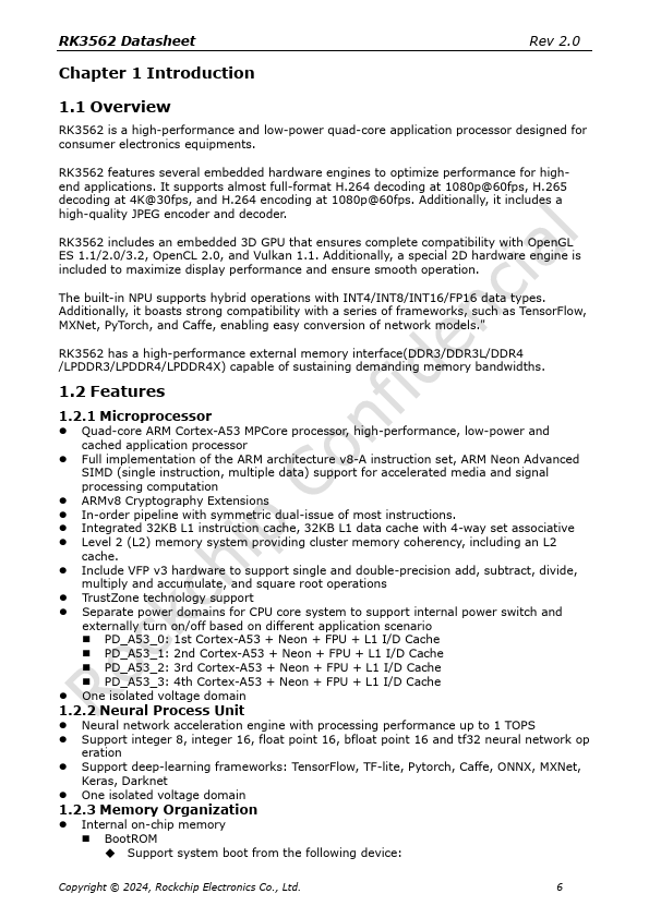 1 RK3562 Datasheet Rev 2.0 Chapter 1 Introduction 1.1 Overview RK3562 is a high-performance and low-power quad-core application processor designed for consumer electronics equipments.