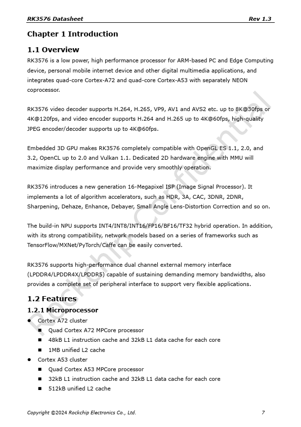 RK3576 Datasheet Rev 1.3 Rockchip RK3576 Datasheet Copyright ©2024 Rockchip Electronics Co., Ltd. 1 RK3576 Datasheet Rev 1.3 Chapter 1 Introduction 1.1 Overview RK3576 is a low power, high performance processor for ARM-based PC and Edge puting device, personal mobile internet device and other digital multimedia applications, and integrates quad-core Cortex-A72 and quad-core Cortex-A53 with separately NEON...