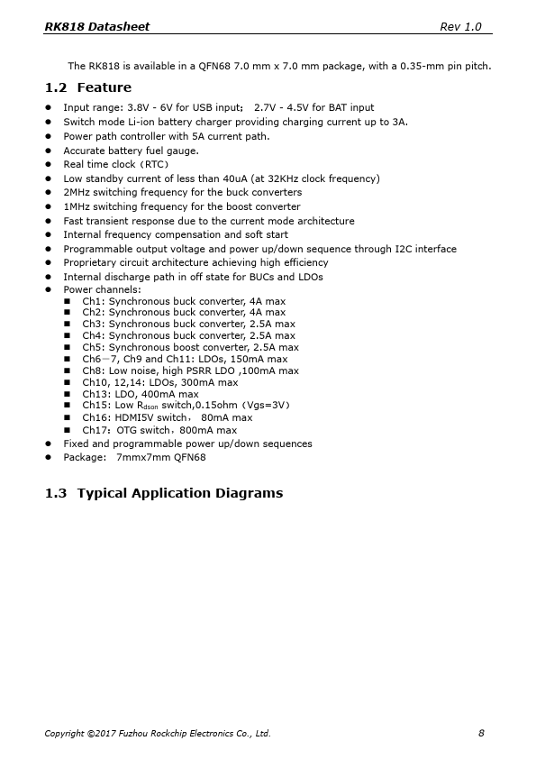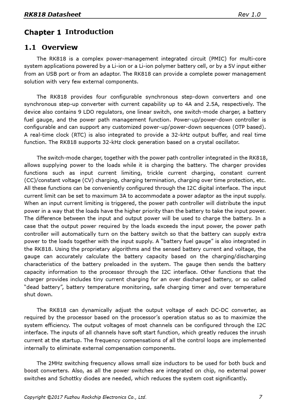 RK818 Datasheet Rev 1.0 Rockchip RK818 Datasheet Revision 1.0 July.2017 Copyright ©2017 Fuzhou Rockchip Electronics Co., Ltd. 1 RK818 Datasheet Rev 1.0 Introduction 1.1 Overview The RK818 is a plex power-management integrated circuit (PMIC) for multi-core system applications powered by a Li-ion or a Li-ion polymer battery cell, or by a 5V input either from an USB port or from an adaptor. The RK818 can provide a...