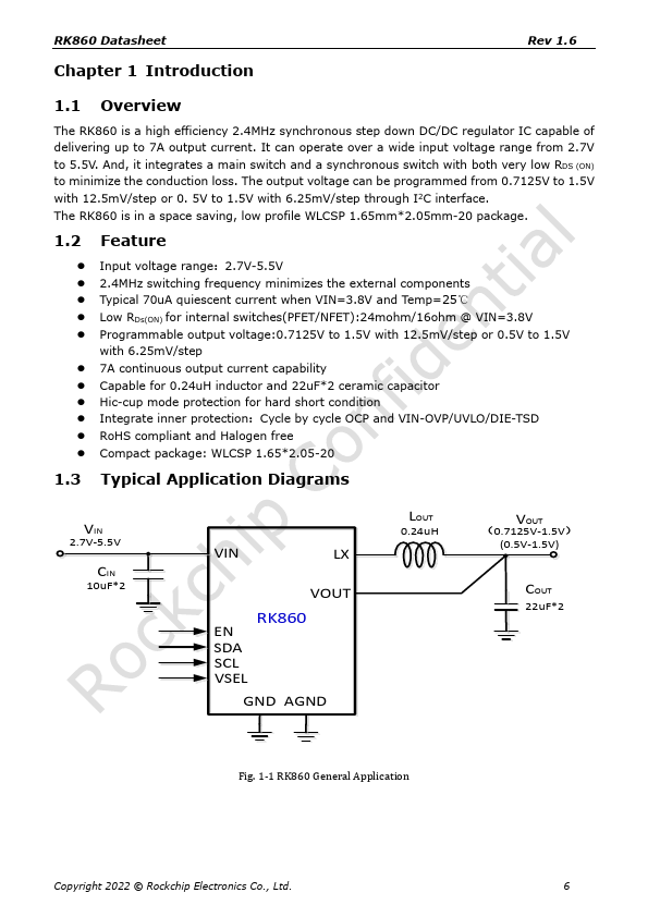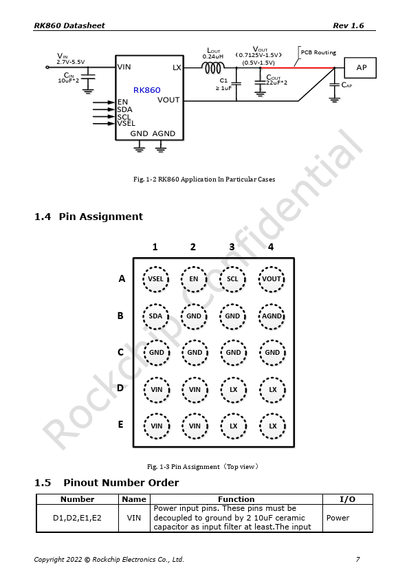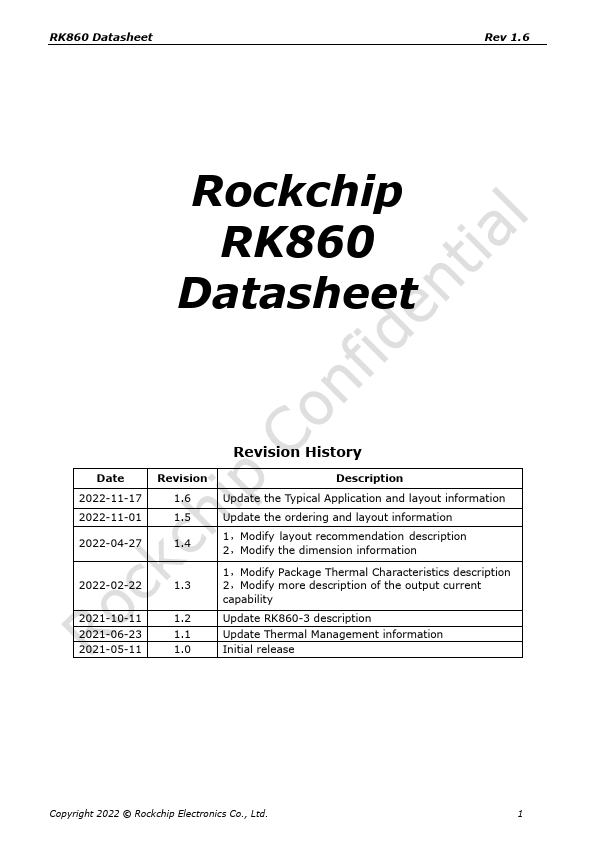 Update the Typical Application and layout information Update the ordering and layout information 1,Modify layout remendation description 2,Modify the dimension information 1,Modify Package Thermal Characteristics description 2,Modify more description of the output current capability Update RK860-3 description Update Thermal Management information Initial release Copyright 2022 © Rockchip Electronics Co., Ltd. 1...
