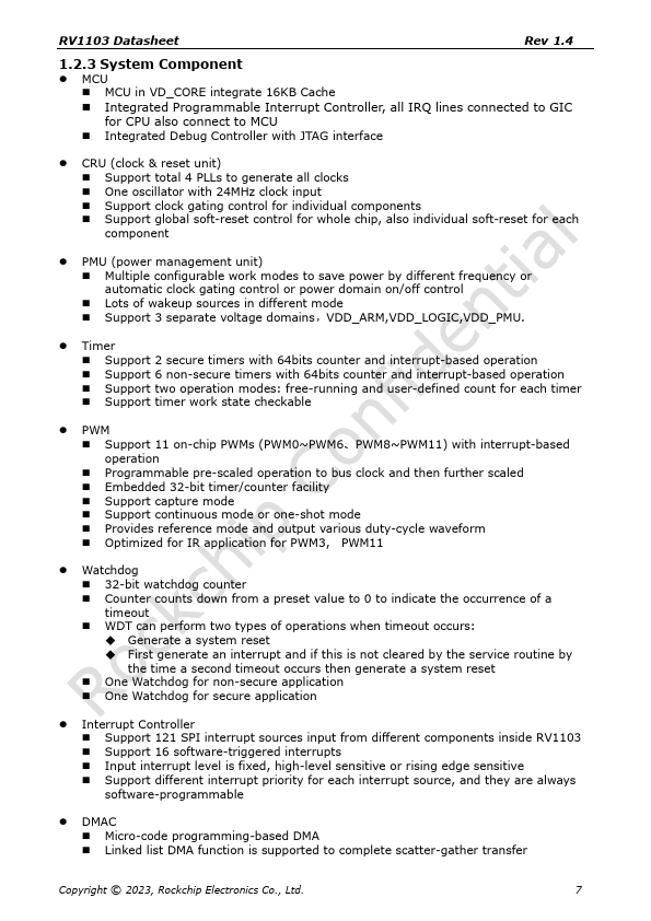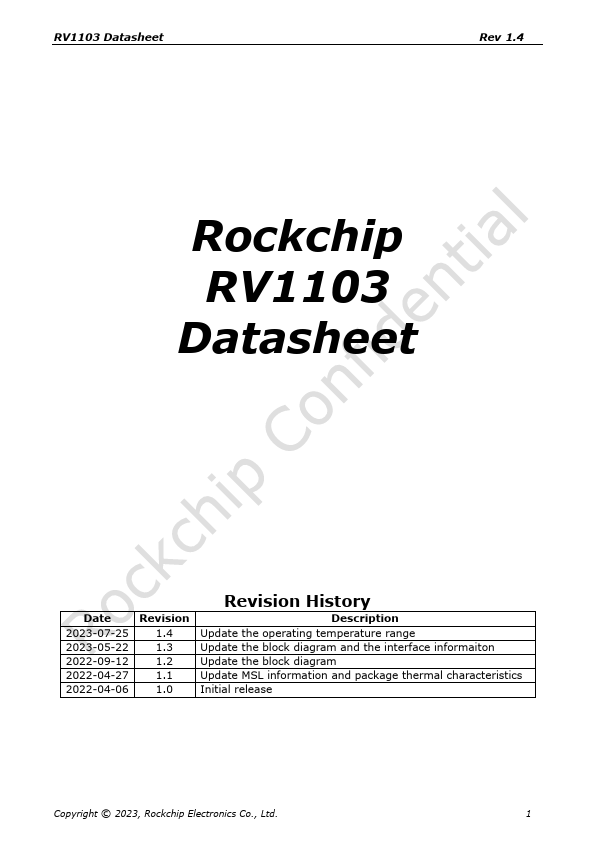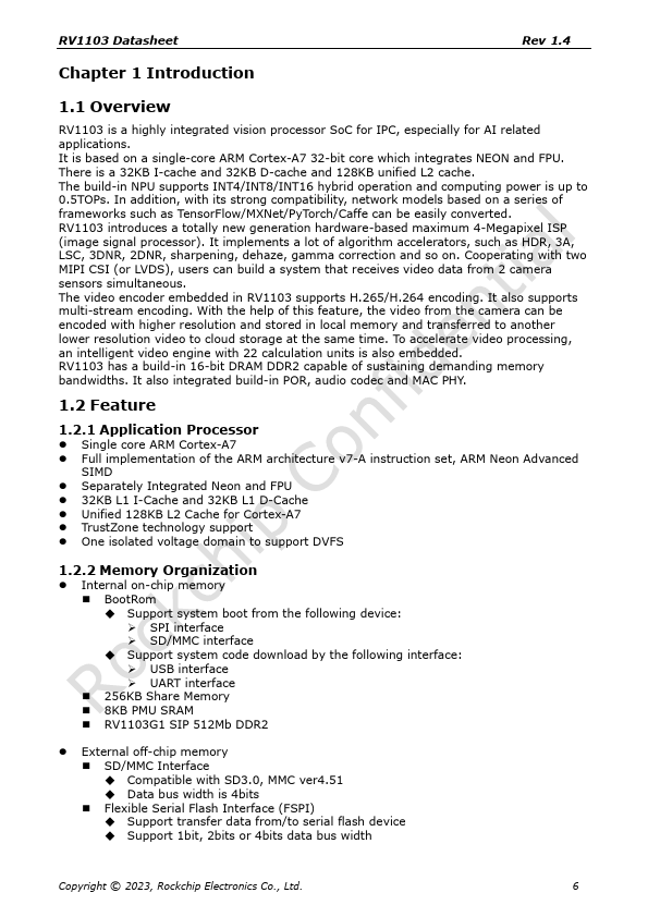Update the operating temperature range Update the block diagram and the interface informaiton Update the block diagram Update MSL information and package thermal characteristics Initial release Copyright © 2023, Rockchip Electronics Co., Ltd. 1 RV1103 Datasheet Rev 1.4 Chapter 1 Introduction 1.1 Overview RV1103 is a highly integrated vision processor SoC for IPC, especially for AI related applications. It is based...