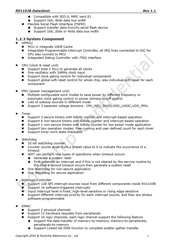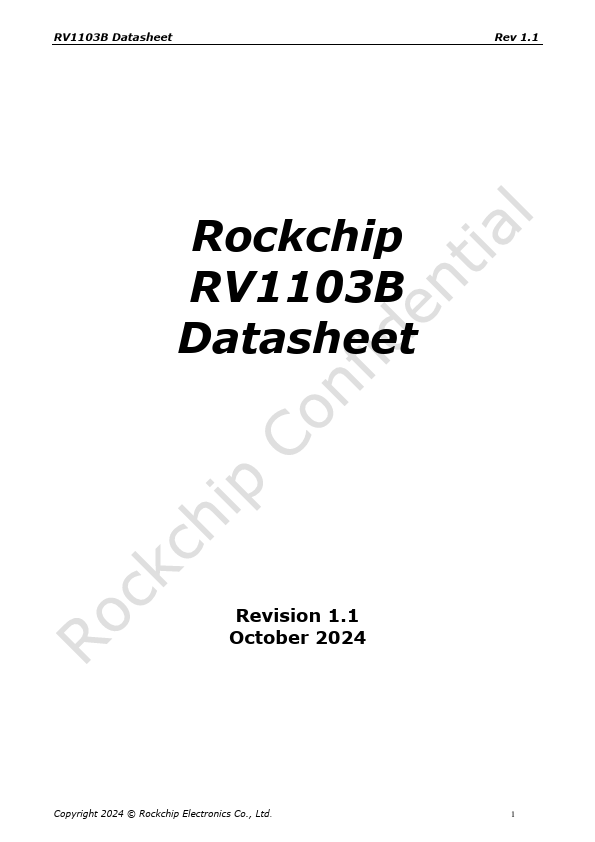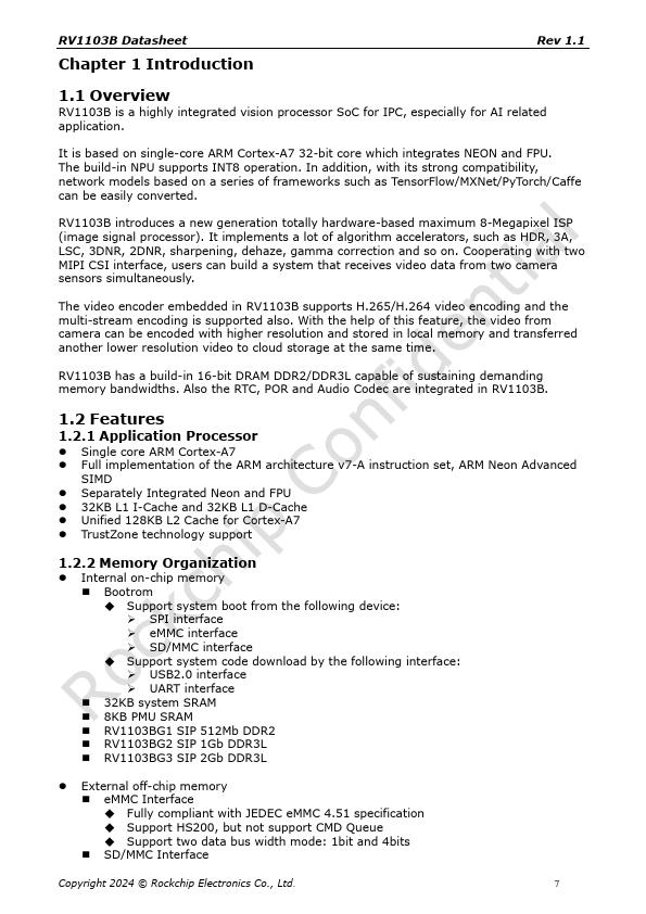 RV1103B Datasheet Rev 1.1 Rockchip RV1103B Datasheet Revision 1.1 October 2024 Copyright 2024 © Rockchip Electronics Co., Ltd. 1 RV1103B Datasheet Chapter 1 Introduction Rev 1.1 1.1 Overview RV1103B is a highly integrated vision processor SoC for IPC, especially for AI related application. It is based on single-core ARM Cortex-A7 32-bit core which integrates NEON and FPU.