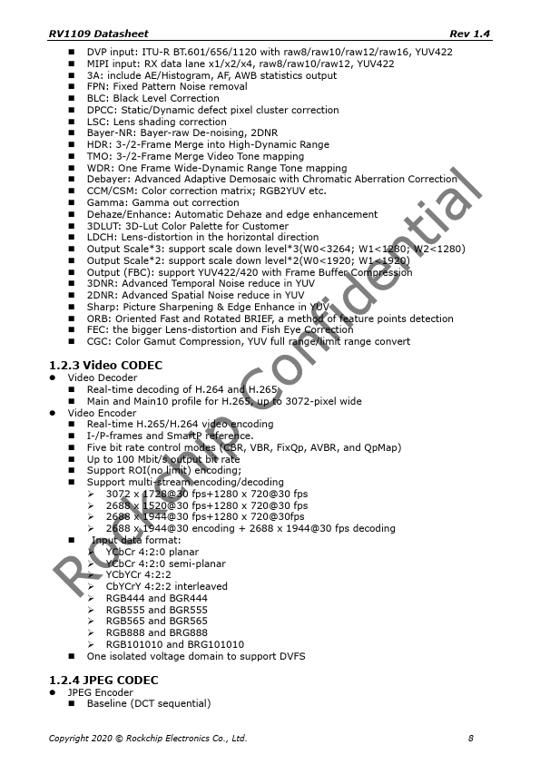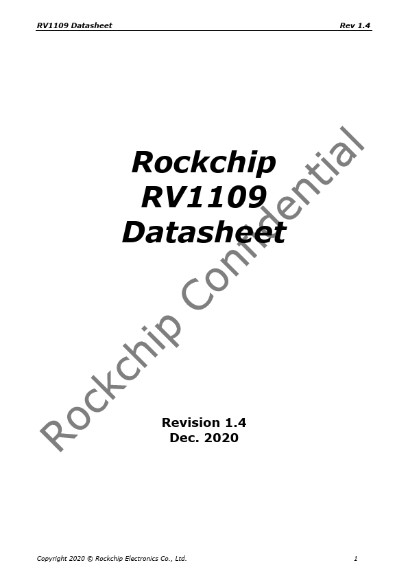 RV1109 Datasheet Rev 1.4 Rockchip RV1109 Datasheet Revision 1.4 Dec. 2020 Copyright 2020 © Rockchip Electronics Co., Ltd. 1 RV1109 Datasheet Rev 1.4 Chapter 1 Introduction 1.1 Overview RV1109 is a high-performance AI vision processor SoC for IPC, or for other intelligent vision applications.