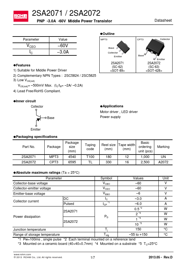 Overview: 2SA2071 / 2SA2072 PNP -3.0A -60V Middle Power Transistor Datasheet Parameter VCEO IC Value 60V 3.