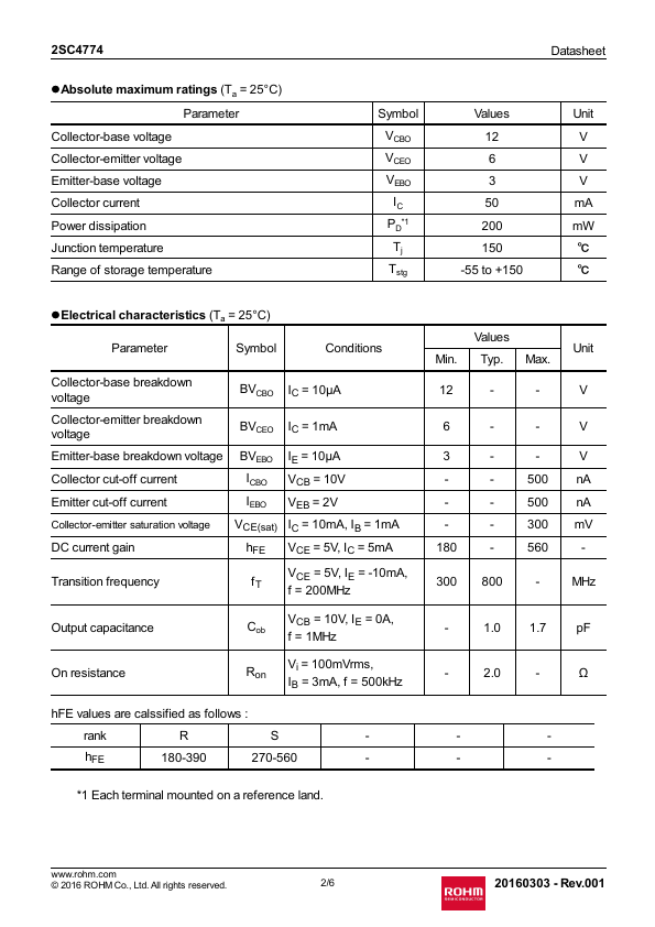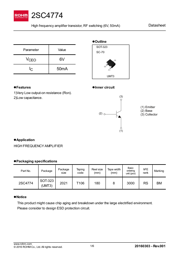 Overview: 2SC4774 High frequency amplifier transistor, RF switching (6V, 50mA) Parameter VCEO IC Value 6V 50mA.