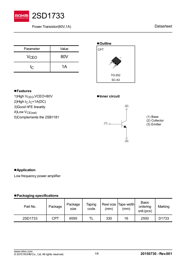 Overview: 2SD1733 Power Transistor(80V,1A) Parameter VCEO Value 80V IC 1A.