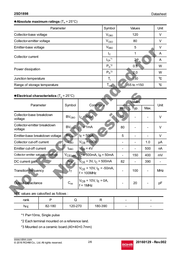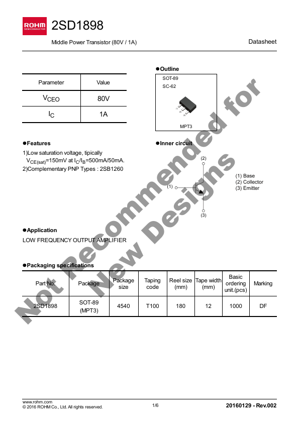 Overview: 2SD1898 Middle Power Transistor (80V / 1A) Datasheet lOutline Parameter Value r VCEO 80V o IC 1A d f.
