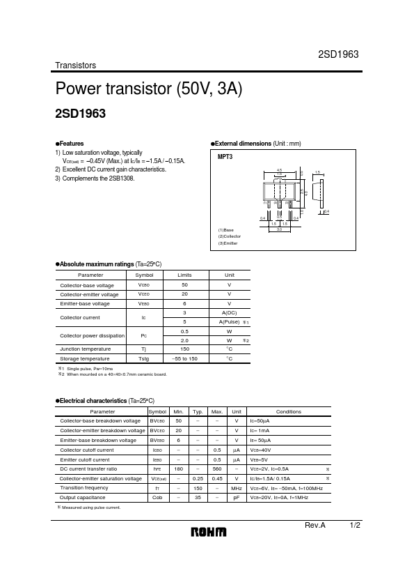 Transistors Power transistor (50V, 3A) 2SD1963 2SD1963 zFeatures 1) Low saturation voltage, typically VCE(sat) = −0.45V (Max.) at IC/IB = −1.5A / −0.15A. 2) Excellent DC current gain characteristics. zExternal dimensions (Unit.