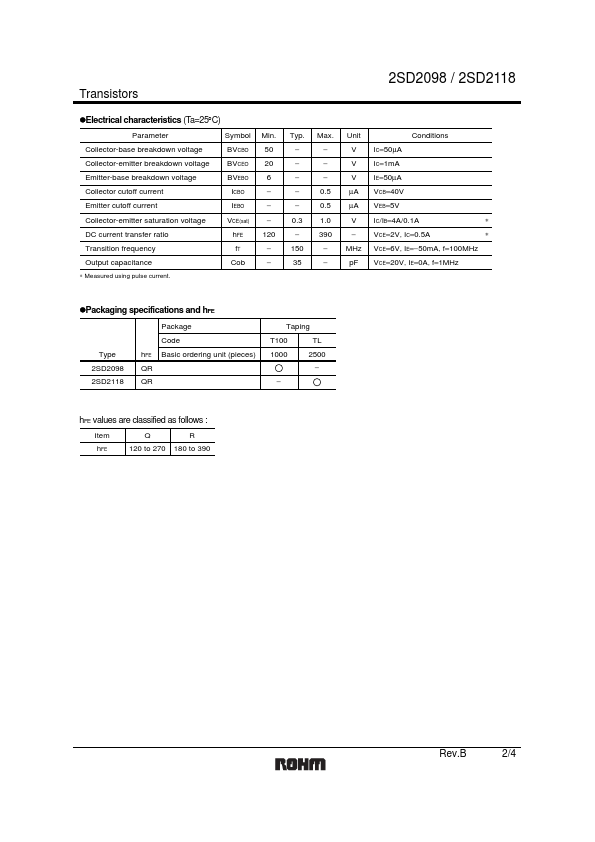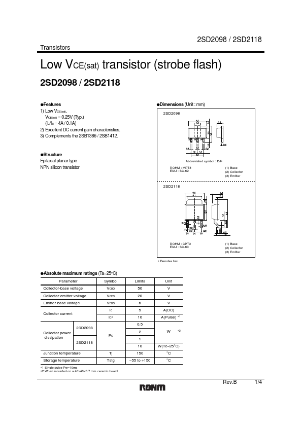 Overview: Transistors 2SD2098 / 2SD2118 Low VCE(sat) transistor (strobe flash) 2SD2098 / 2SD2118.