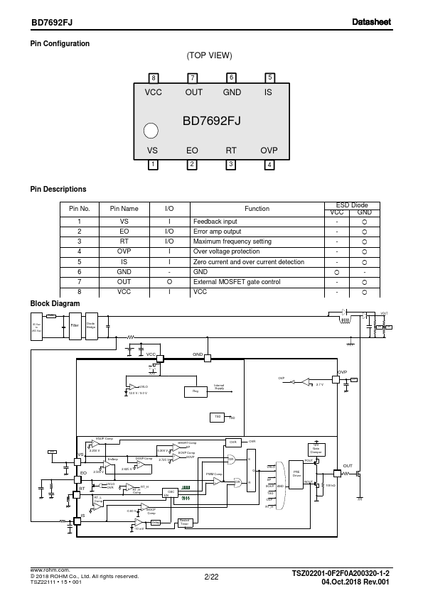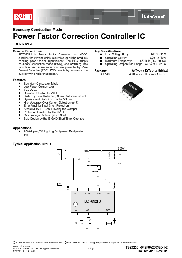 BD7692FJ is Power Factor Correction for AC/DC supplies the system which is suitable for all the products needing power factor improvement. The PFC adopts boundary conduction mode (BCM), and switching loss reduction and noise reduction are possible by Zero Current Detection (ZCD). ZCD detects by resistance, the auxiliary winding is unnecessary.