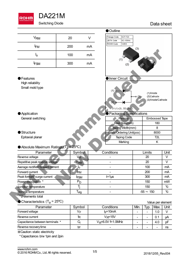 DA221M Switching Diode Data sheet Outline VRM 20 V IFM Io r IFSM.