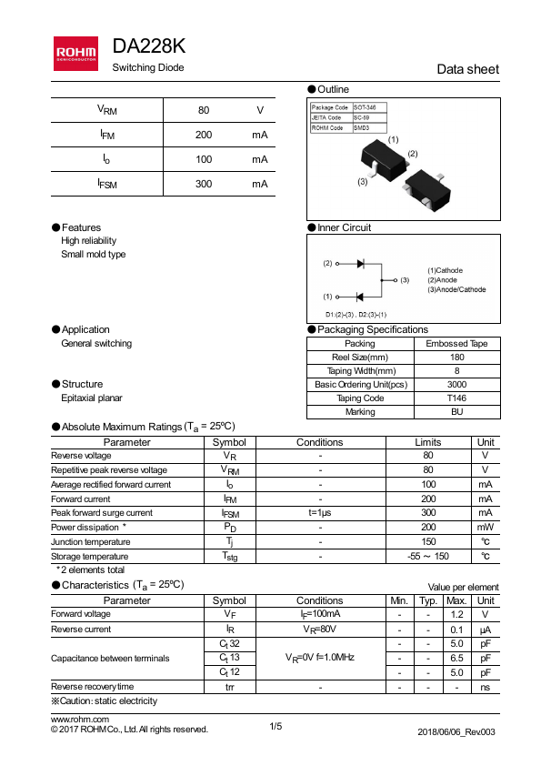 DA228K Switching Diode Outline VRM 80 V IFM 200 mA Io 100 mA IFSM 300.