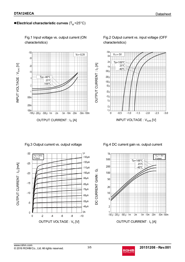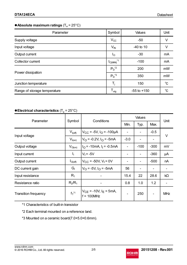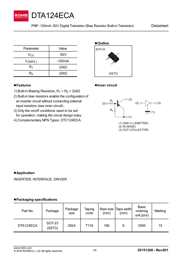 3) Only the on/off conditions need to be set for operation, making the circuit design easy. lOutline SOT-23 (SST3) lInner circuit Datasheet lApplication INVERTER, INTERFACE, DRIVER lPackaging specifications Part No. Package DTA124ECA SOT-23 (SST3) Package size 2924 Taping code Reel size Tape width (mm) (mm) Basic ordering unit.(pcs) Marking T116 180 8 3000 15 .rohm.