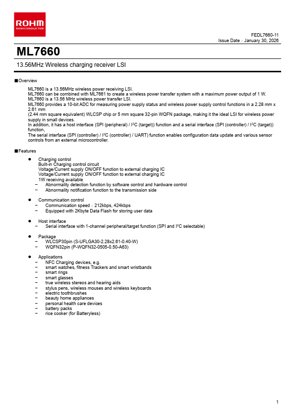 ML7660 13.56MHz Wireless charging receiver LSI FEDL7660-11 Issue Date:January 30, 2026 Overview ML7660 is a 13.56MHz wireless power receiving LSI. ML7660 can be bined with ML7661 to create a wireless power transfer system with a maximum power output of 1 W. ML7660 is a 13.56 MHz wireless power transfer LSI.