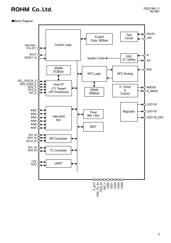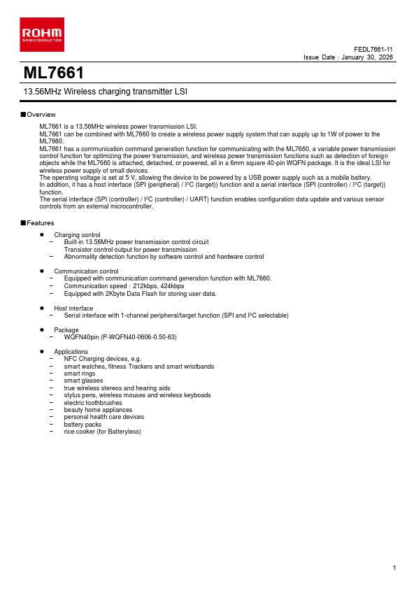 ML7661 13.56MHz Wireless charging transmitter LSI FEDL7661-11 Issue Date:January 30, 2026 Overview ML7661 is a 13.56MHz wireless power transmission LSI. ML7661 can be bined with ML7660 to create a wireless power supply system that can supply up to 1W of power to the ML7660. ML7661 has a munication mand generation function for municating with the ML7660, a variable power transmission control function for optimizing...