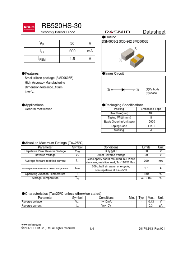 RB520HS-30 Schottky Barrier Diode VR IO IFSM 30 V 200 mA 1.5 A Datasheet Outline DSN0603-2 SOD-962 SMD0603B (1).