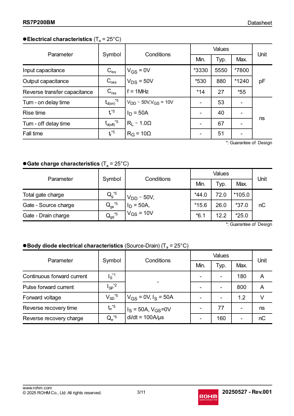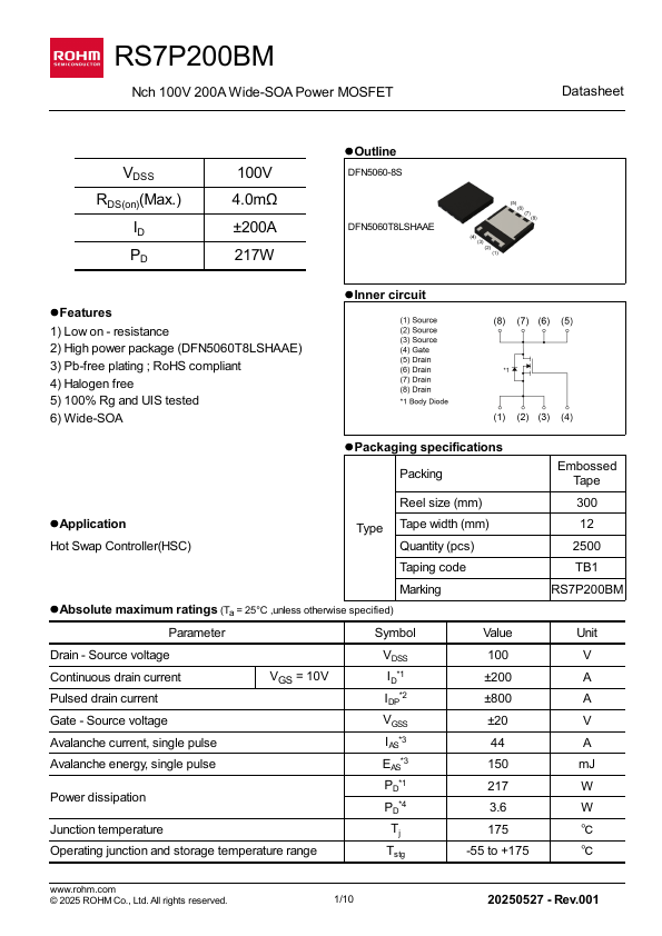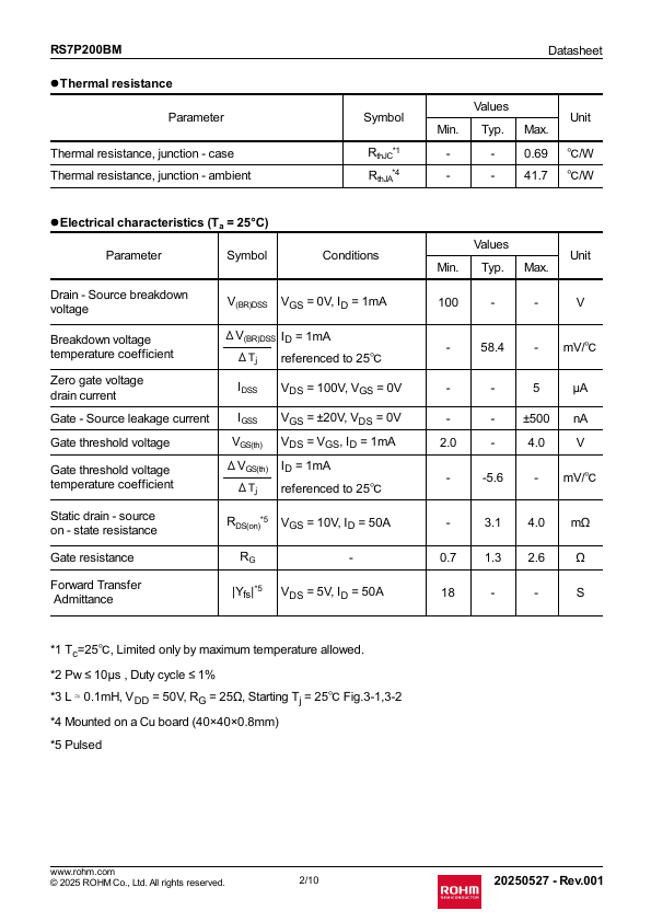 1/10 20250527 - Rev.001 RS7P200BM lThermal resistance Parameter , junction - case , junction - ambient Datasheet Symbol RthJC 1 RthJA 4 Values Unit Min.