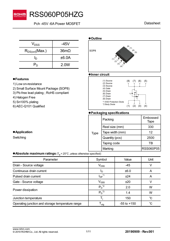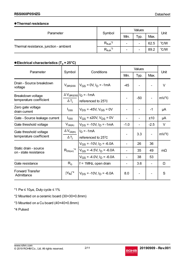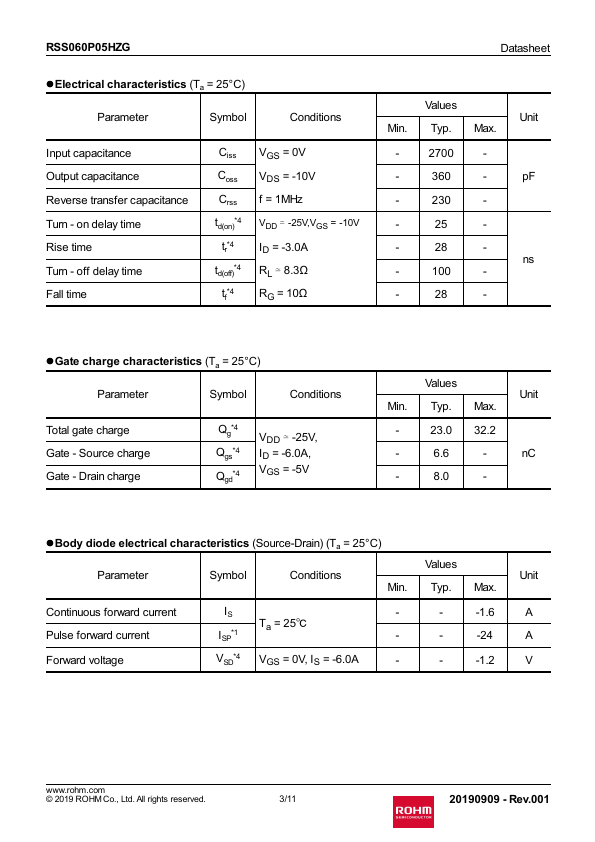 1/11 20190909 - Rev.001 RSS060P05HZG lThermal resistance Parameter , junction - ambient Datasheet Symbol RthJA 2 RthJA 3 Values Unit Min. - 2700 - - 360 - pF - 230 - - 25 - -.