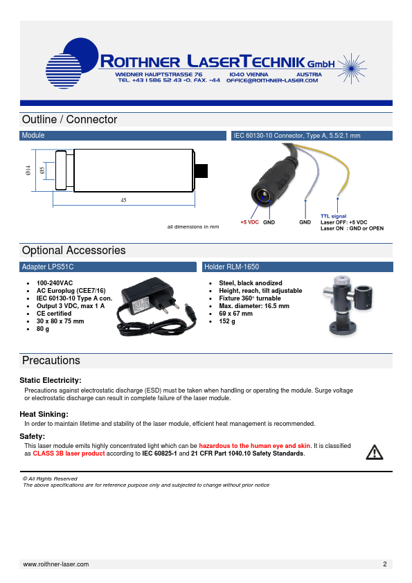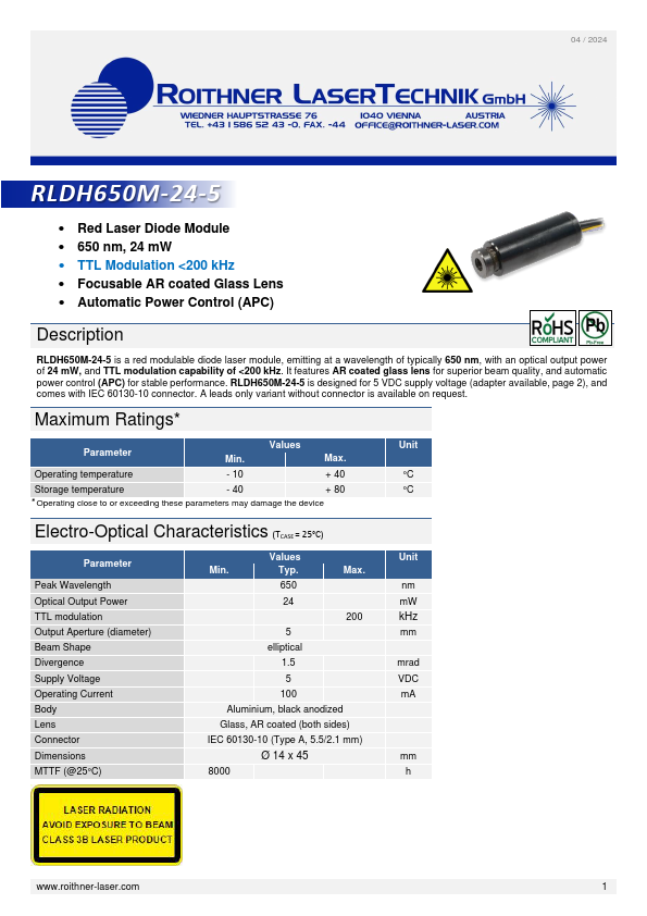 RLDH650M-24-5 is a red modulable diode laser module, emitting at a wavelength of typically 650 nm, with an optical output power of 24 mW, and TTL modulation capability of <200 kHz.