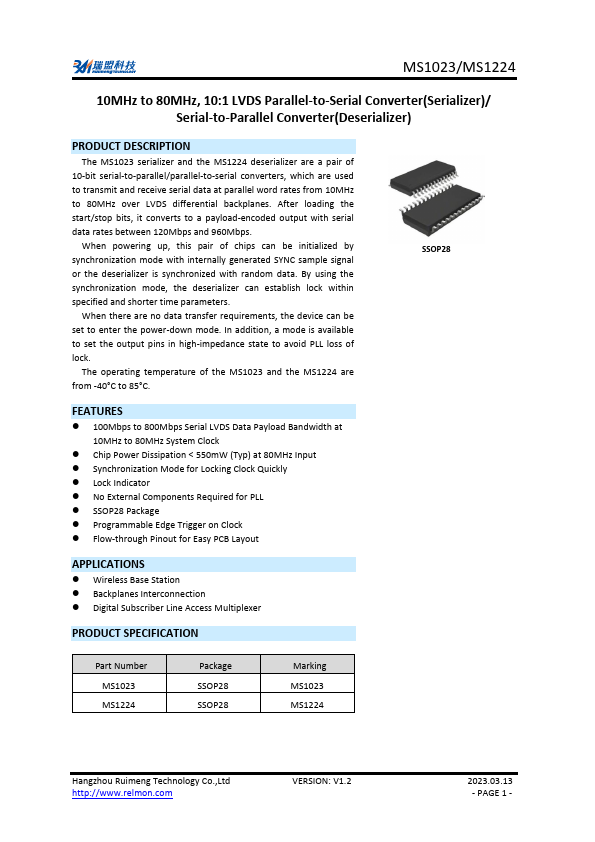 The MS1023 serializer and the MS1224 deserializer are a pair of 10-bit serial-to-parallel/parallel-to-serial converters, which are used to transmit and receive serial data at parallel word rates from 10MHz to 80MHz over LVDS differential backplanes. After loading the start/stop bits, it converts to a payload-encoded output with serial data rates between 120Mbps and 960Mbps. When powering up, this pair of chips can...