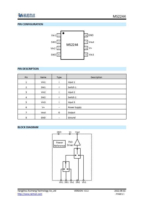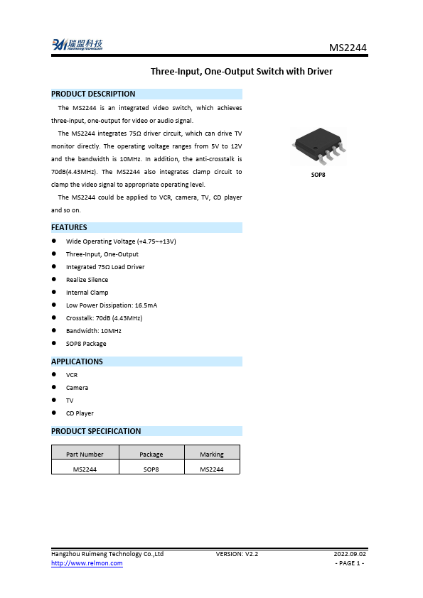 The MS2244 is an integrated video switch, which achieves threeinput, oneoutput for video or audio signal. The MS2244 integrates 75Ω driver circuit, which can drive TV monitor directly. The operating voltage ranges from 5V to 12V and the bandwidth is 10MHz.