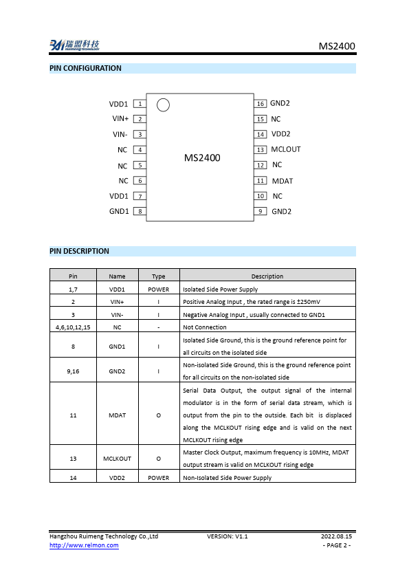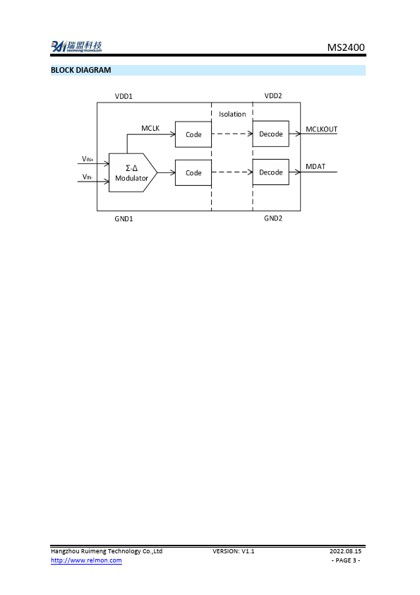 The MS2400 is a secondorder ΣΔ modulator, an onchip digital isolator, that converts analog input signals to highspeed 1bit bitstream. The modulator continuously samples the input signal without requiring an external sample hold circuit. The full range of analog input signal is ±320mV with a maximum data rate of 10 MHz for the converted digital stream.