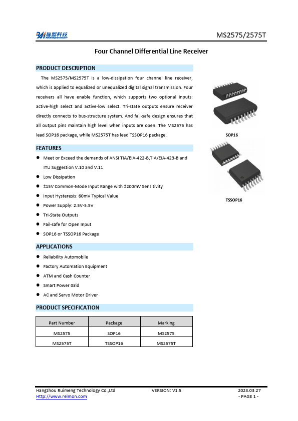 The MS2575/MS2575T is a low-dissipation four channel line receiver, which is applied to equalized or unequalized digital signal transmission. Four receivers all have enable function, which supports two optional inputs: active-high select and active-low select.