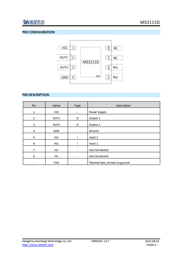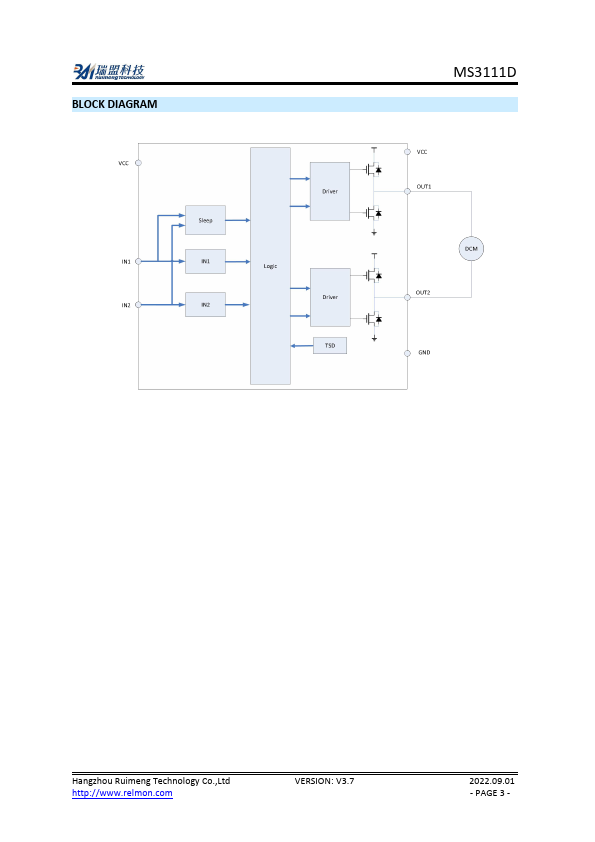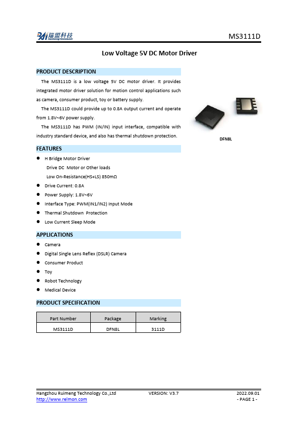 The MS3111D is a low voltage 5V DC motor driver. It provides integrated motor driver solution for motion control applications such as camera, consumer product, toy or battery supply. The MS3111D could provide up to 0.8A output current and operate from 1.8V6V power supply.